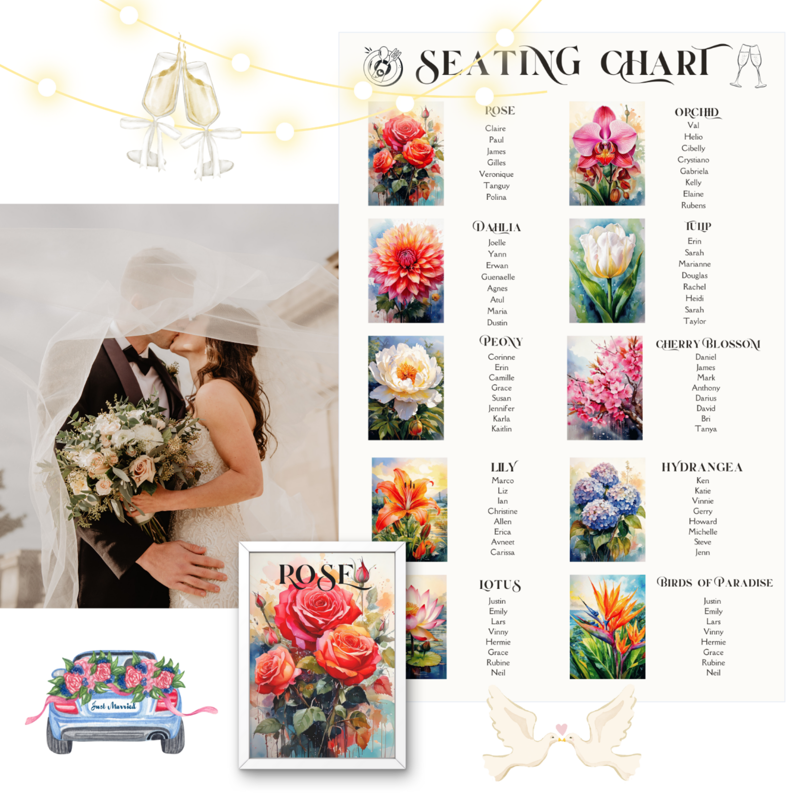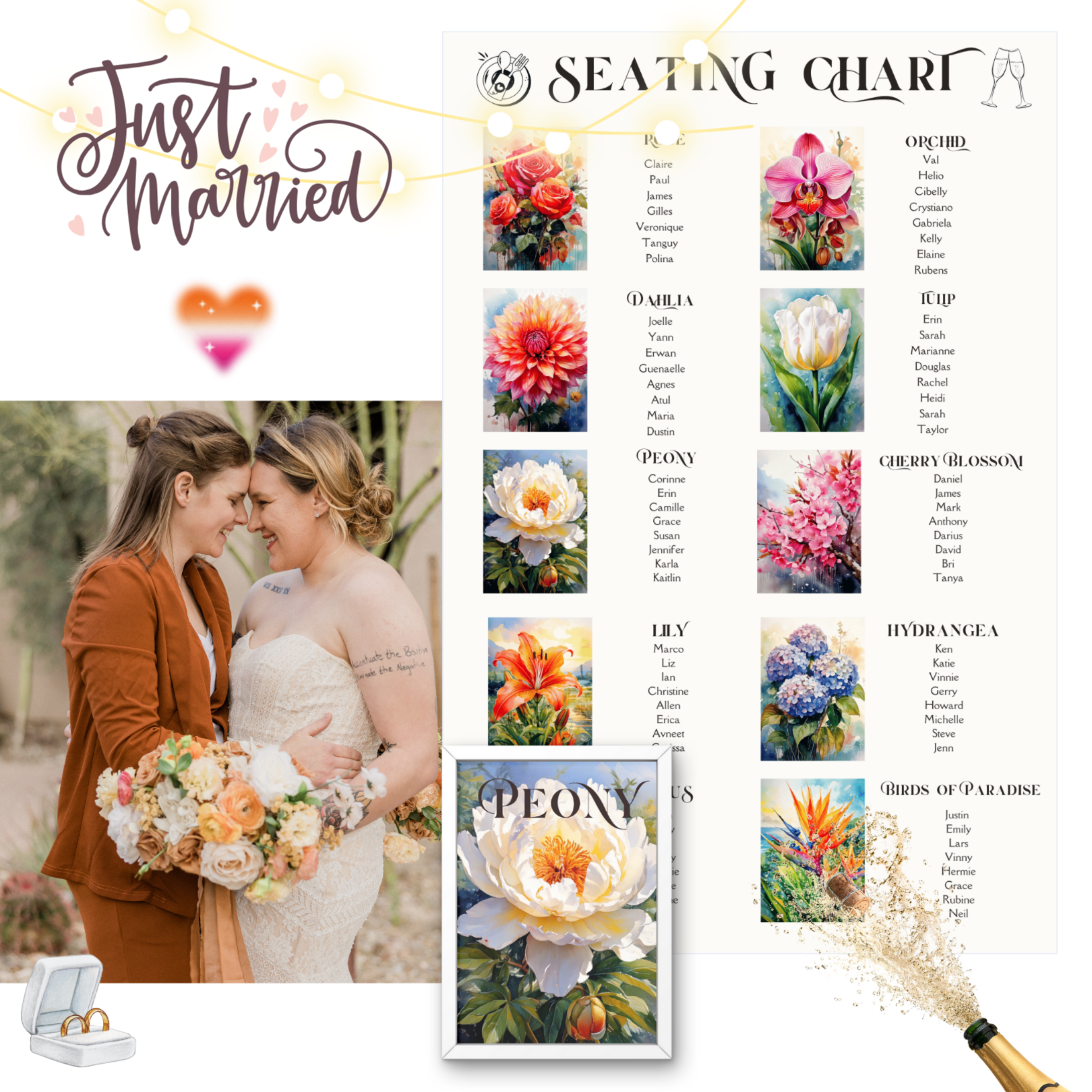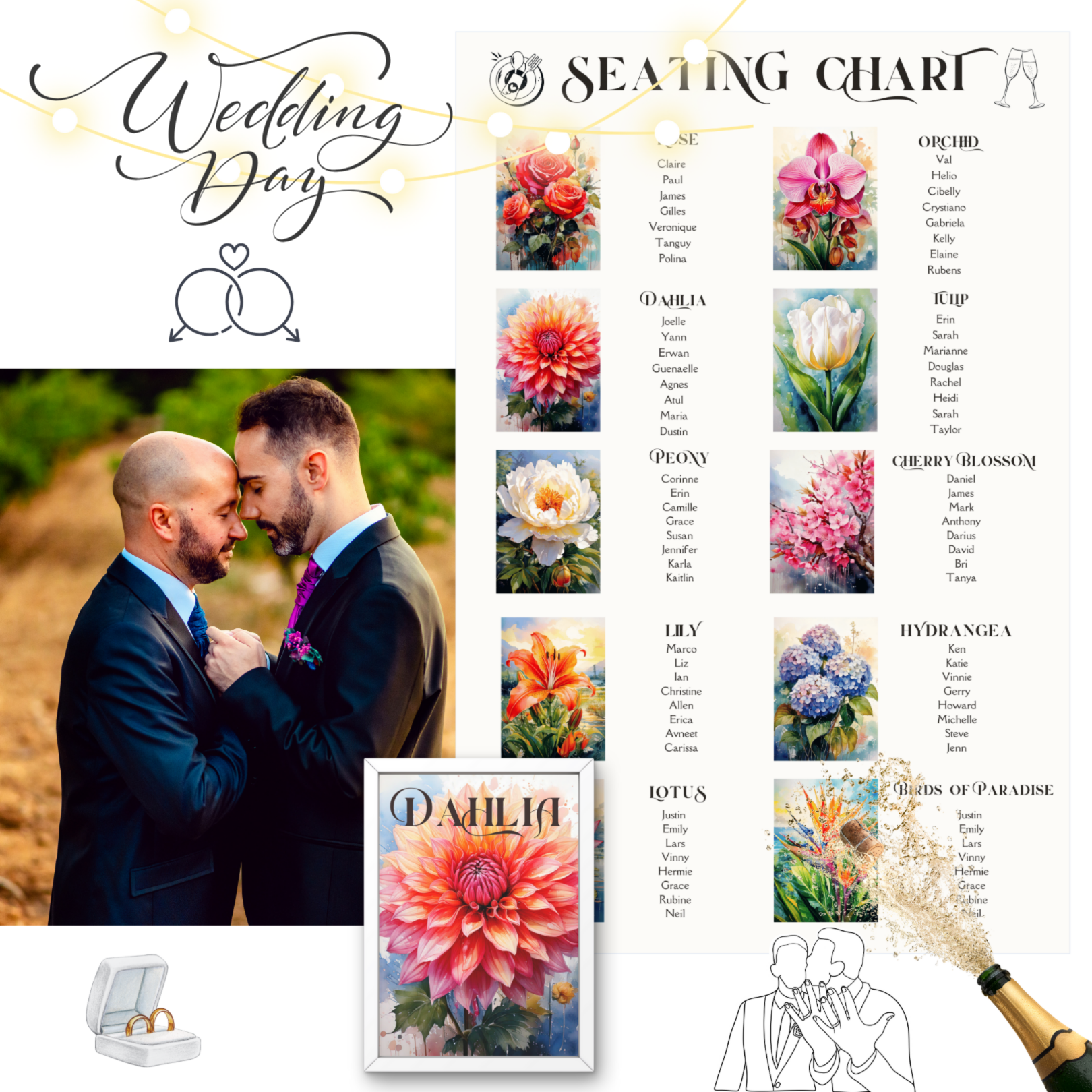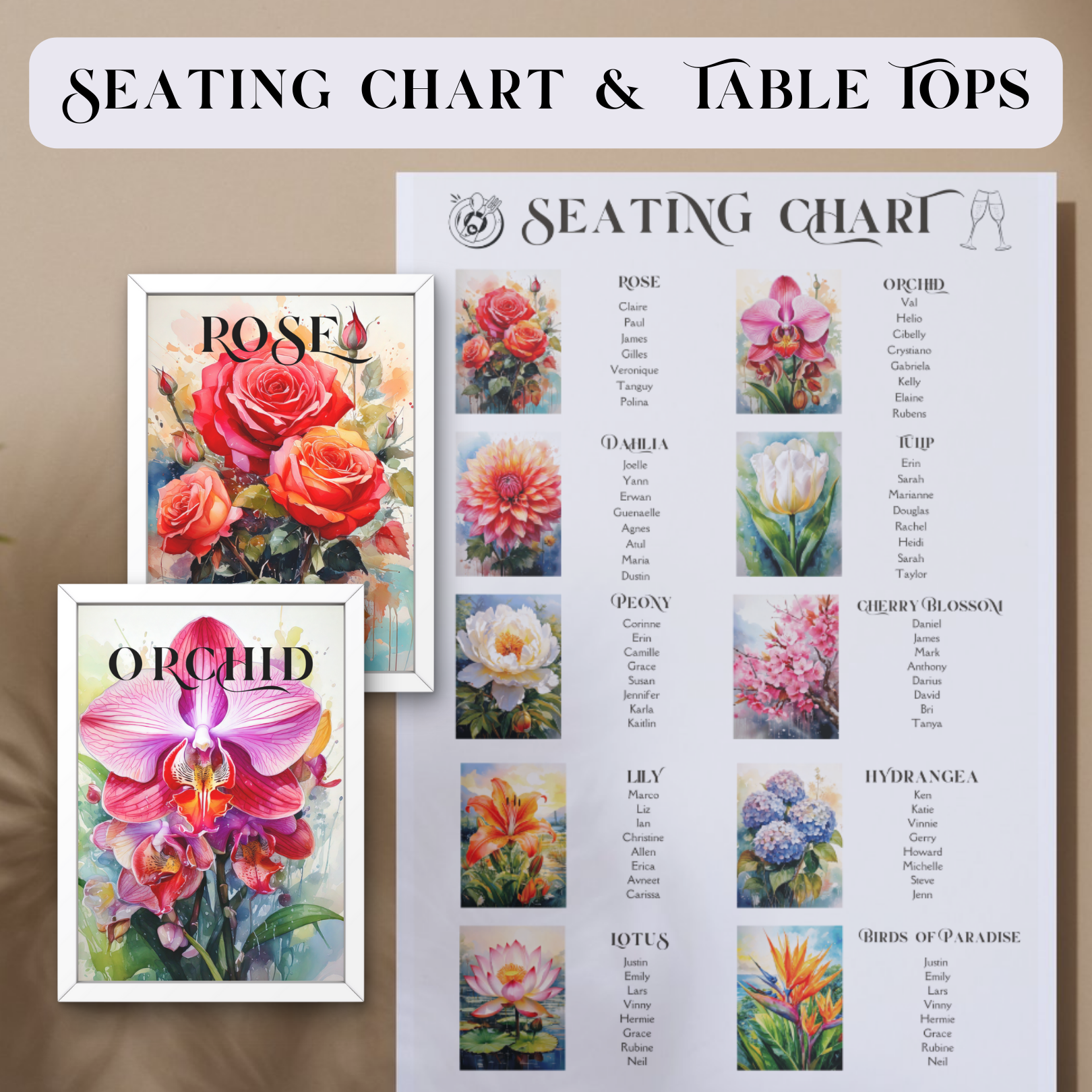 Your guests deserve a seamless experience, and you deserve a seating chart that actually looks stunning in your wedding decor. Designed with hydrangeas, peonies, orchids, roses, cherry blossoms, birds of paradise, lilies, dahlias, lotuses, and tulips, this chart brings the perfect mix of elegance and personality to your reception.