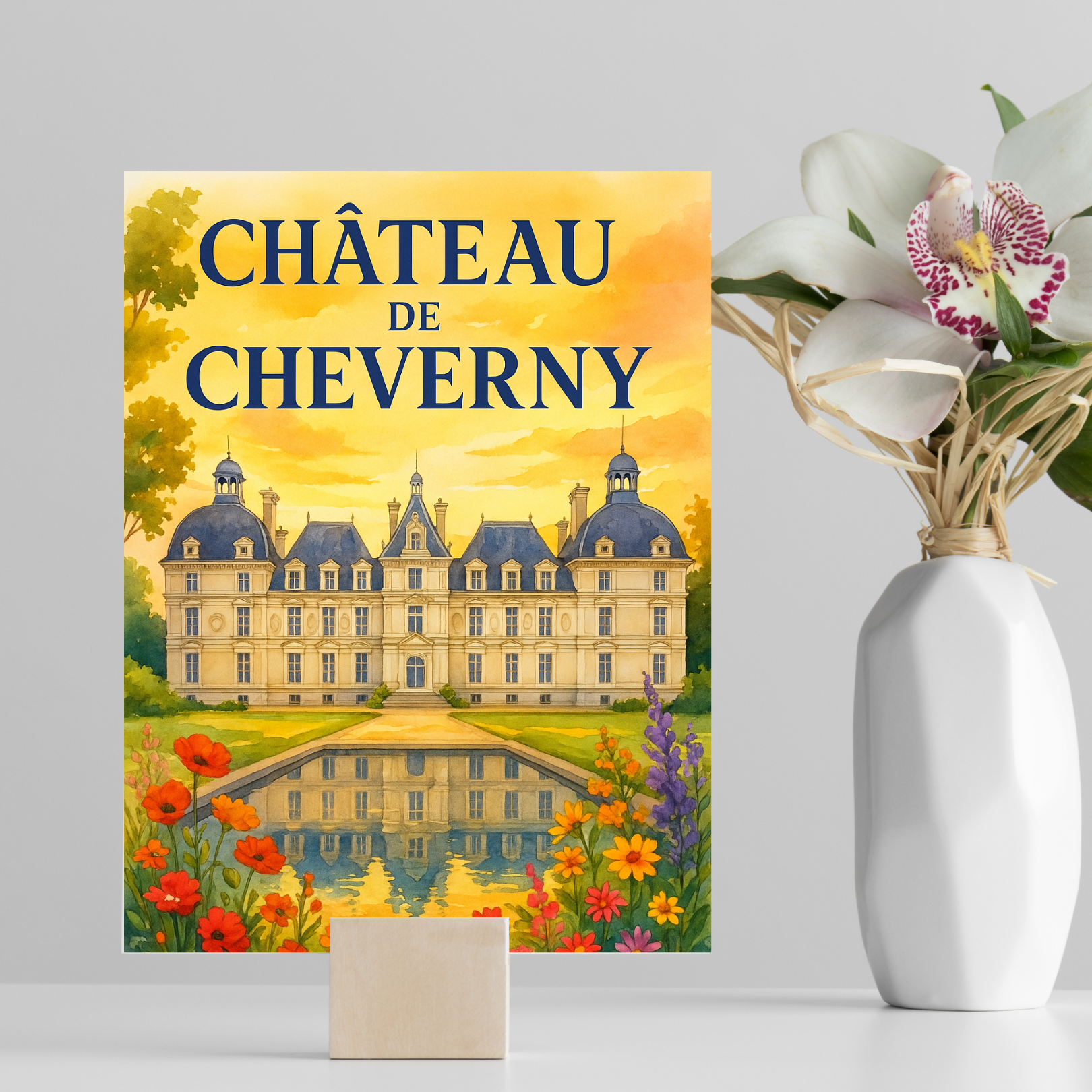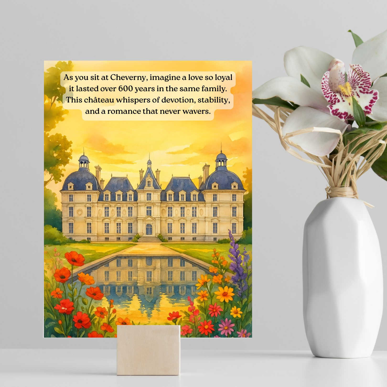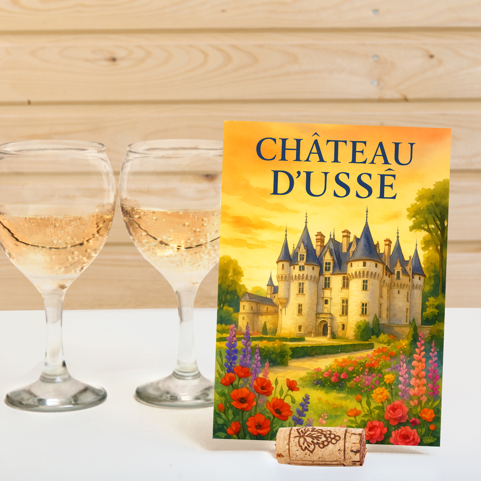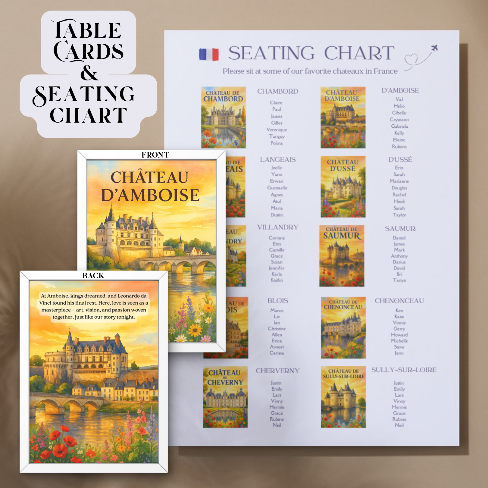Each table is named after a famous château in France — Chambord, Chenonceau, Amboise, Villandry, Saumur, and more — illustrated in soft, romantic watercolor tones. It’s a true statement piece for couples who dream of Europe and love French elegance.
