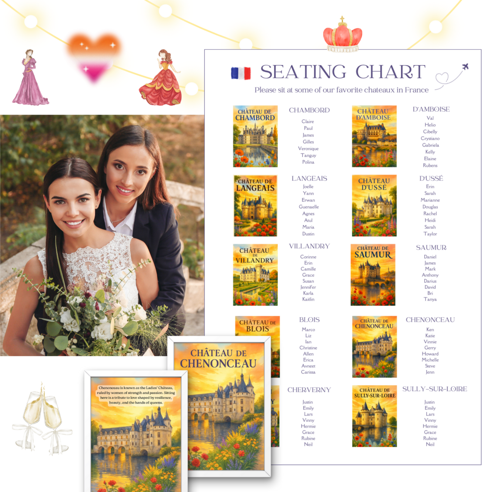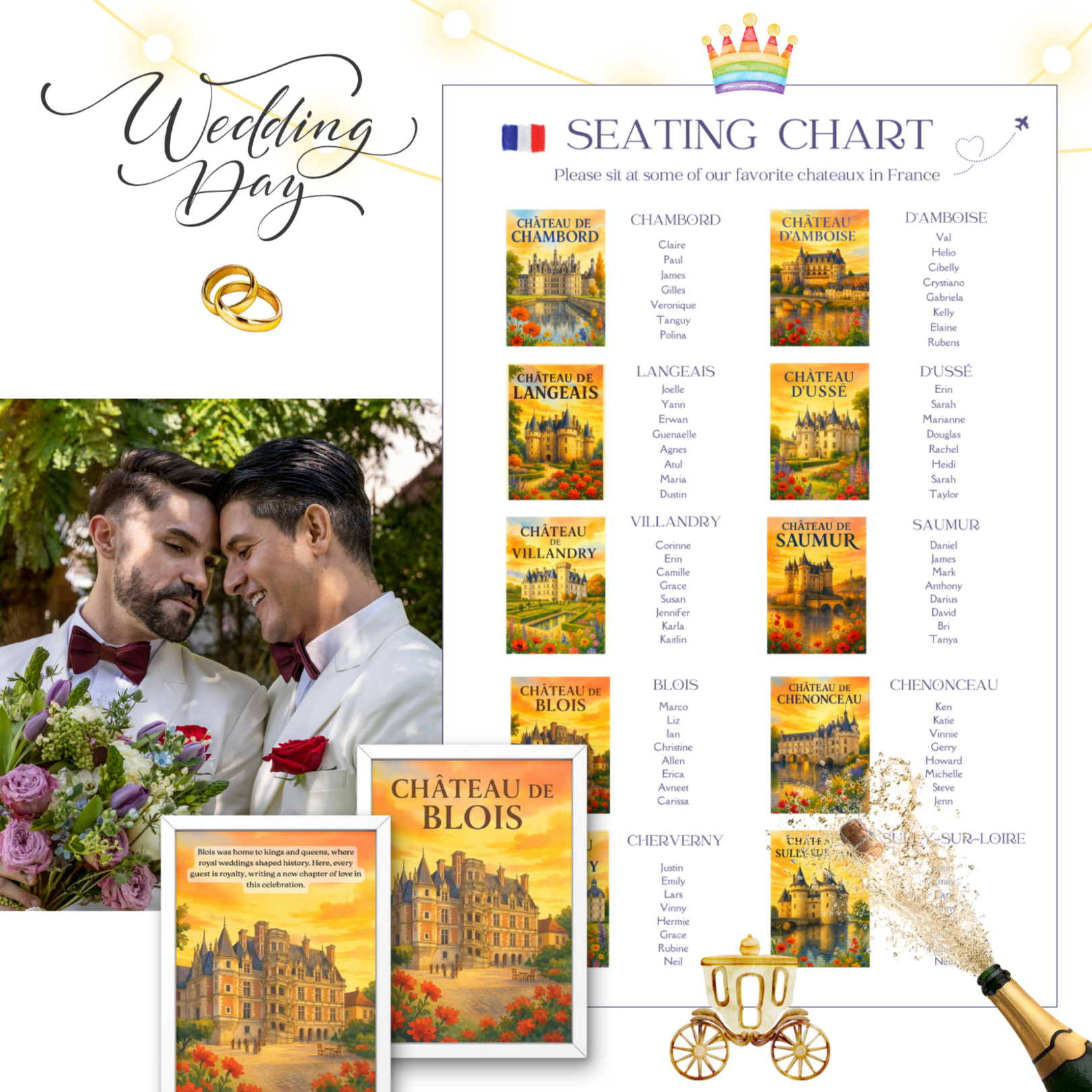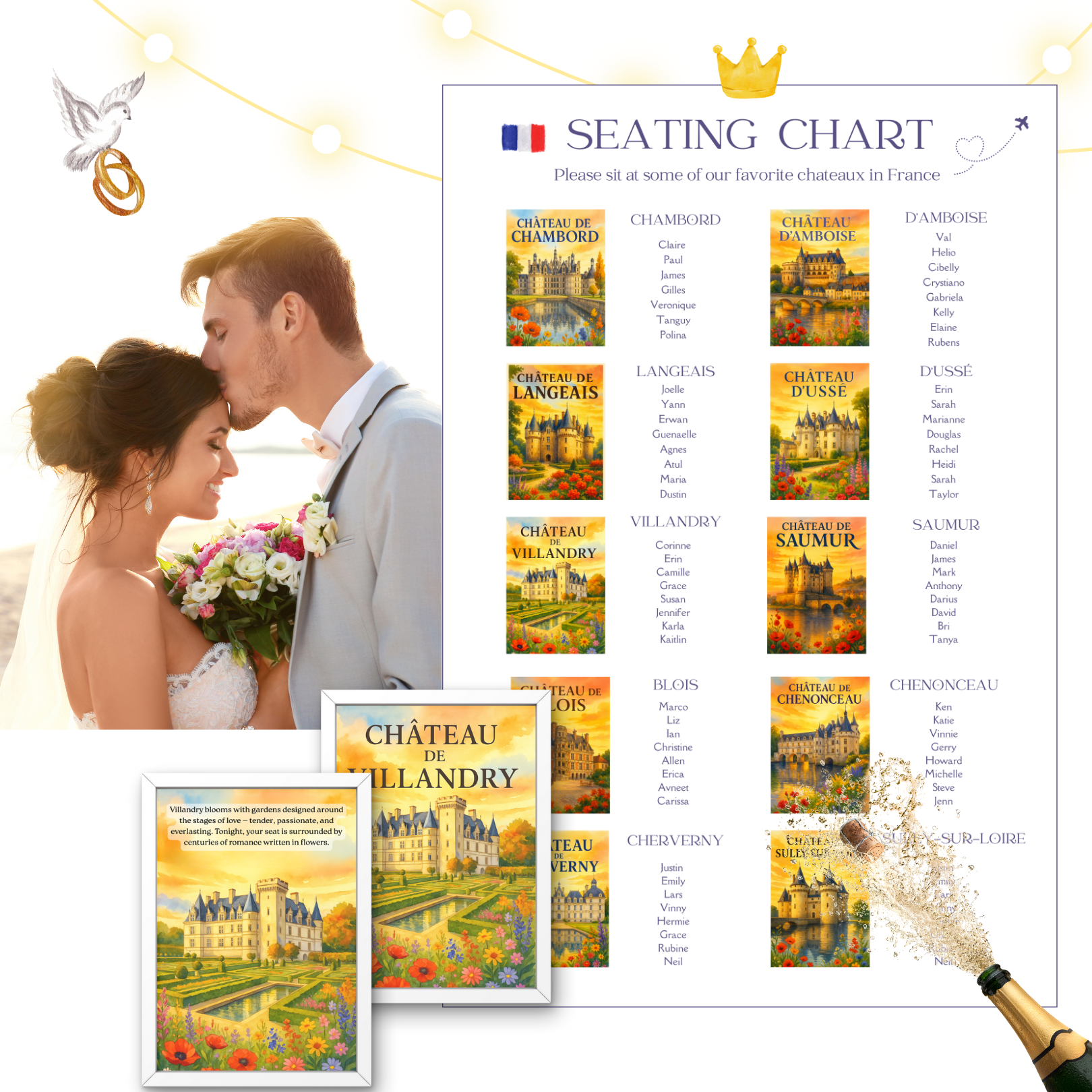 Bring romance and wanderlust to your wedding with this French Château Wedding Seating Chart, inspired by the magical Loire Valley. Perfect for destination weddings, travel-loving couples, and château-inspired celebrations, this elegant chart helps guests find their seats while doubling as a stunning décor piece.