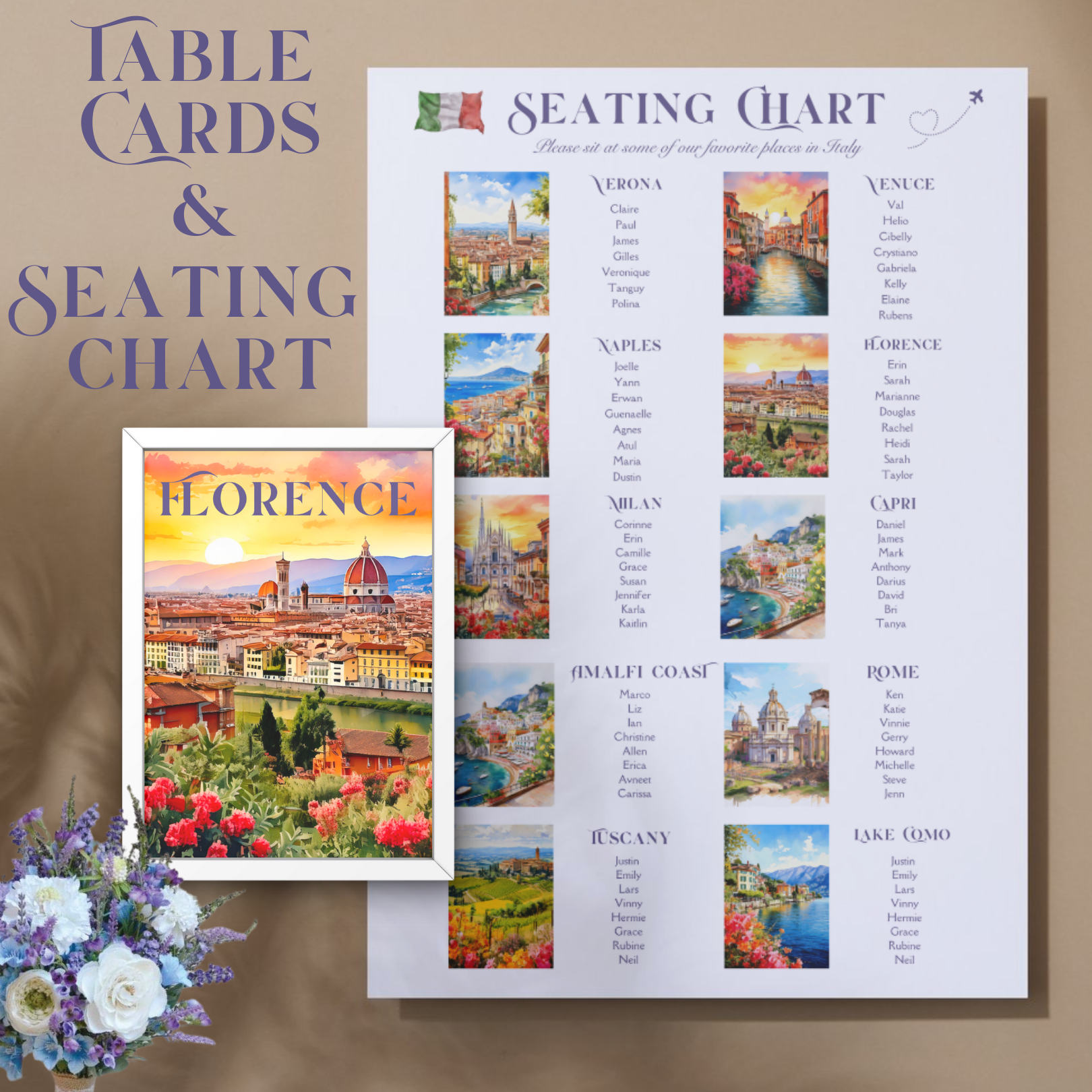 • Table Tops 5"x7": 10 Travel Themed ( Verona, Naples, Milan, Amalfi Coast, Tuscany, Venice, Florence, Capri, Rome, Lake Como) ready to print PDF Files